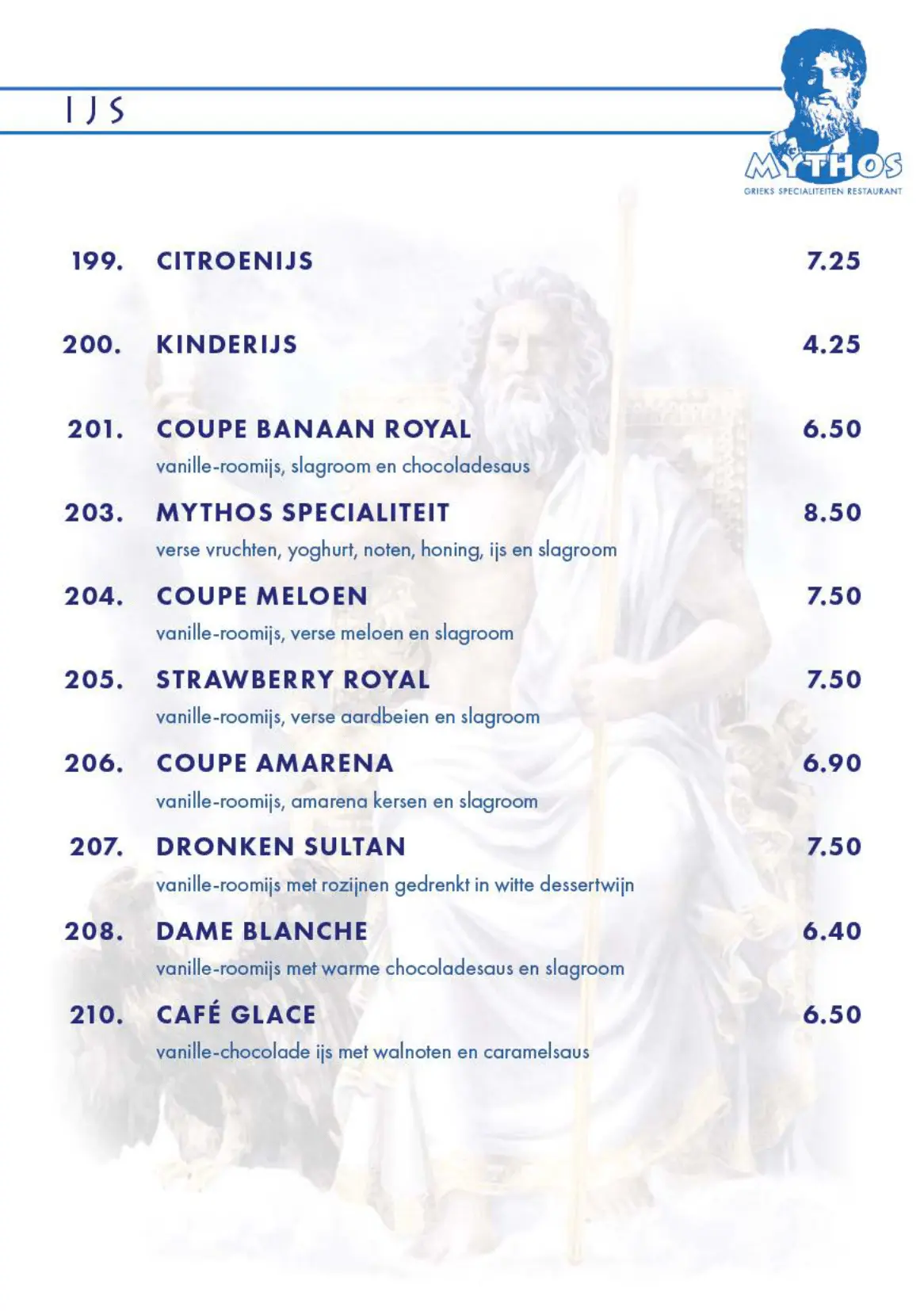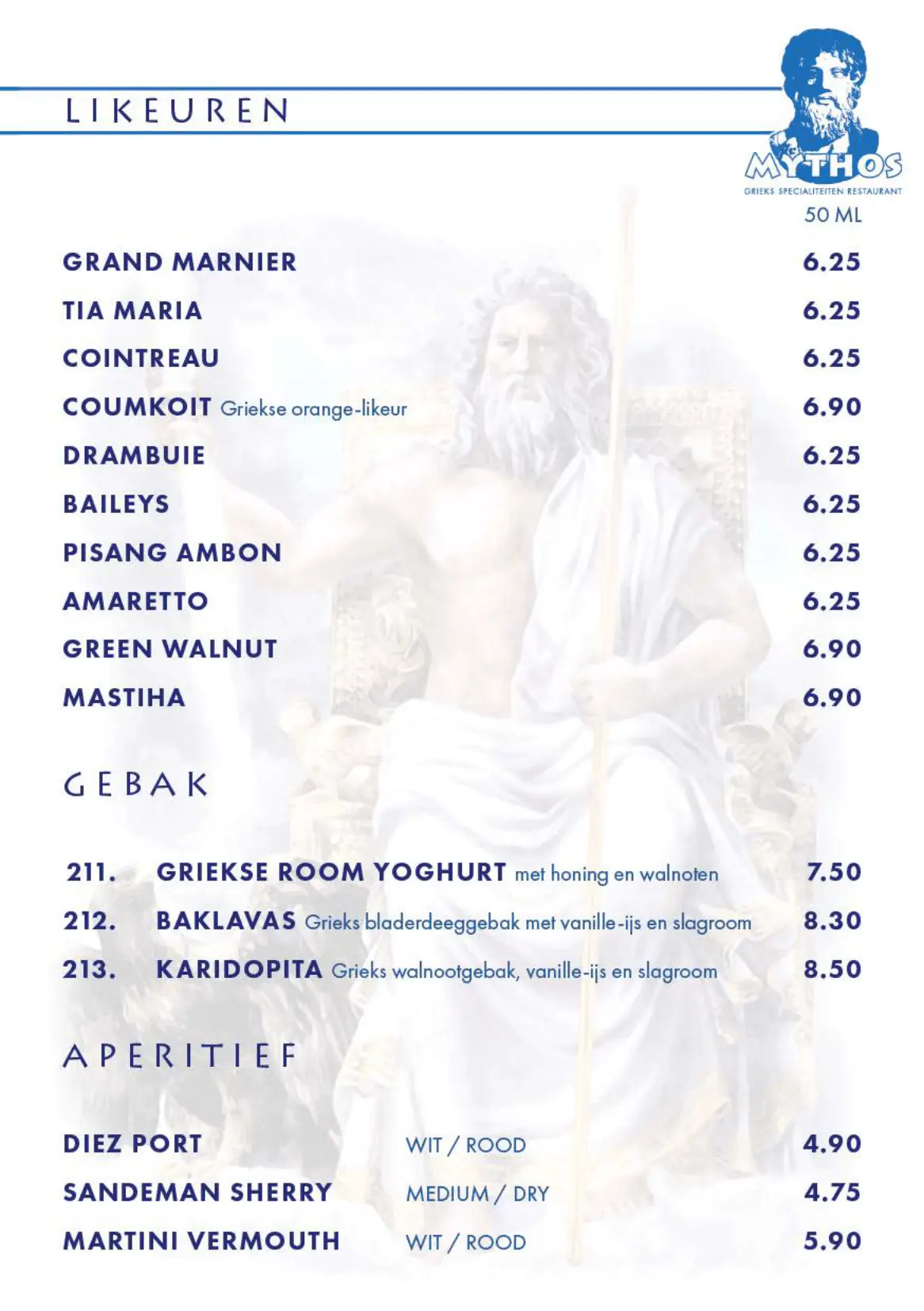 Geniet van onze Griekse desserts, ijs, likeuren en meer. De ideale afsluiting van uw avond bij Mythos.